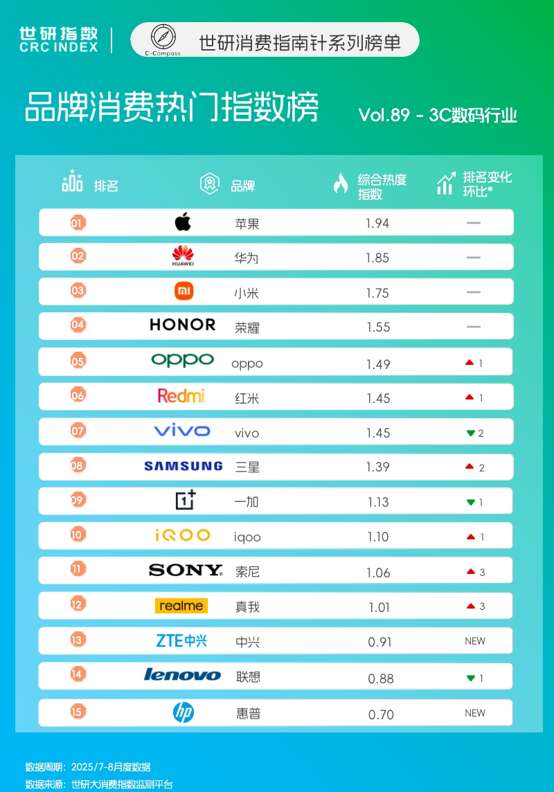 本次监测周期内,苹果、华为和小米以1.94、1.85、1.75的综合热度位列榜单综合热度前三。